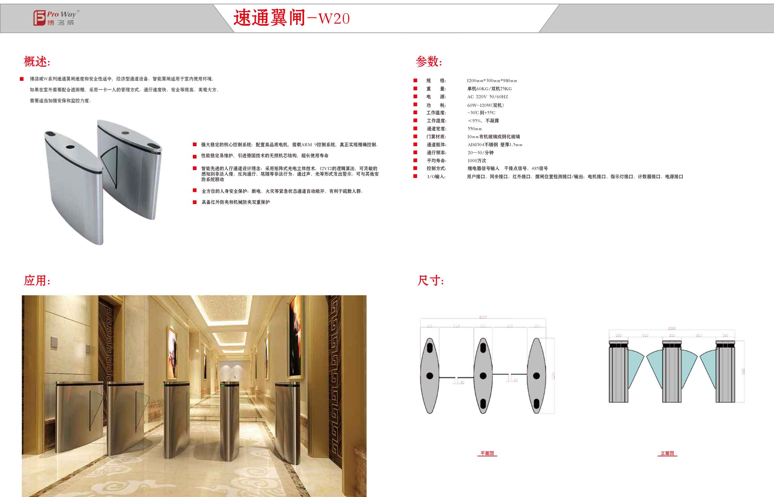 翼閘-W20速通翼閘 適用范圍:ProWay博洛威 W20型號速通翼閘適用于人行通道管理,如企業(yè)、工業(yè)園、娛樂場所、景區(qū)、寫字樓等場合。如在室外使用需要配合遮雨棚,采用一卡一人的管理方式。W20速通翼閘在常規(guī)通道內(nèi)均能正常使用。