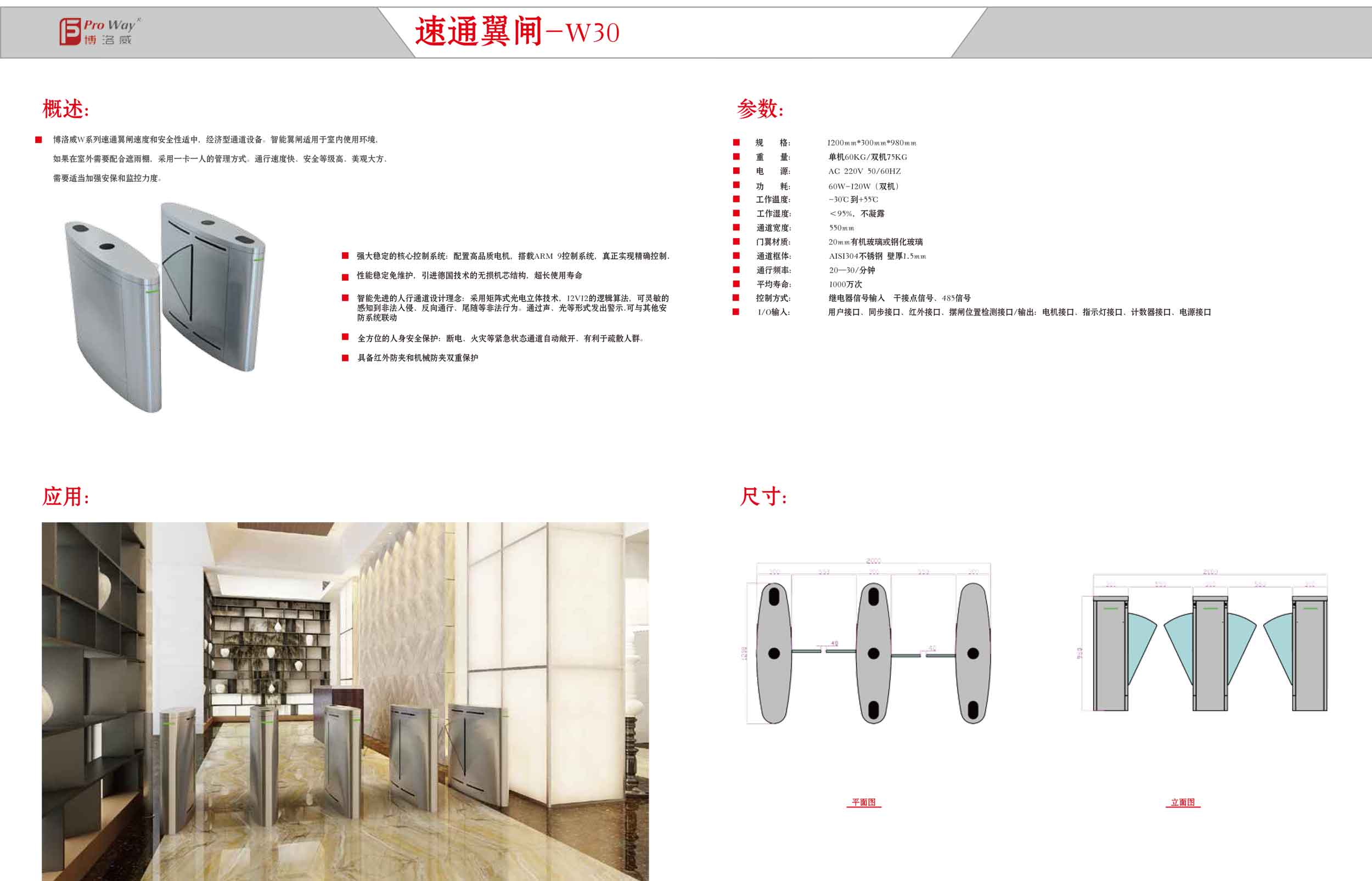 翼閘-W30速通翼閘 適用范圍:ProWay博洛威 W30型號速通翼閘適用于人行通道管理,如企業(yè)、工業(yè)園、娛樂場所、景區(qū)、寫字樓等場合。如在室外使用需要配合遮雨棚,采用一卡一人的管理方式。W30速通翼閘在常規(guī)通道內(nèi)均能正常使用。