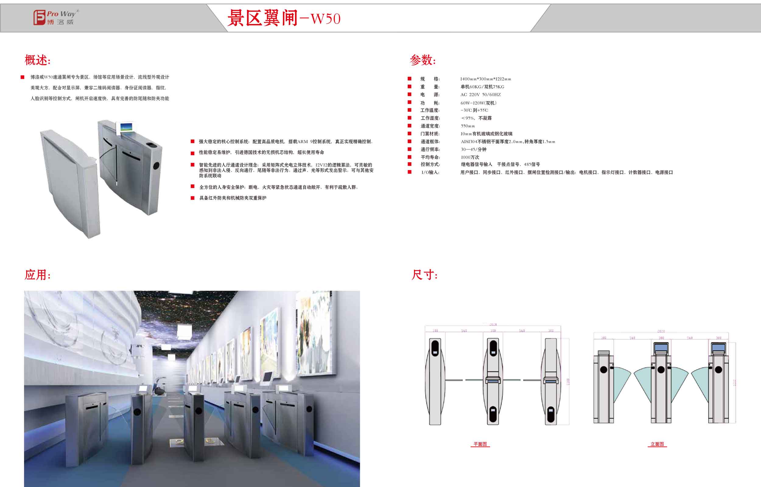 博洛威W50速通翼閘專為景區(qū),場館等應(yīng)用場景設(shè)計,流線型外觀設(shè)計,美觀大方、配合對顯示屏、兼容二維碼閱讀器、身份證閱讀器、指紋、人臉識別等控制方式,閘機開啟速度快,具有完善的防尾隨和防夾功能。