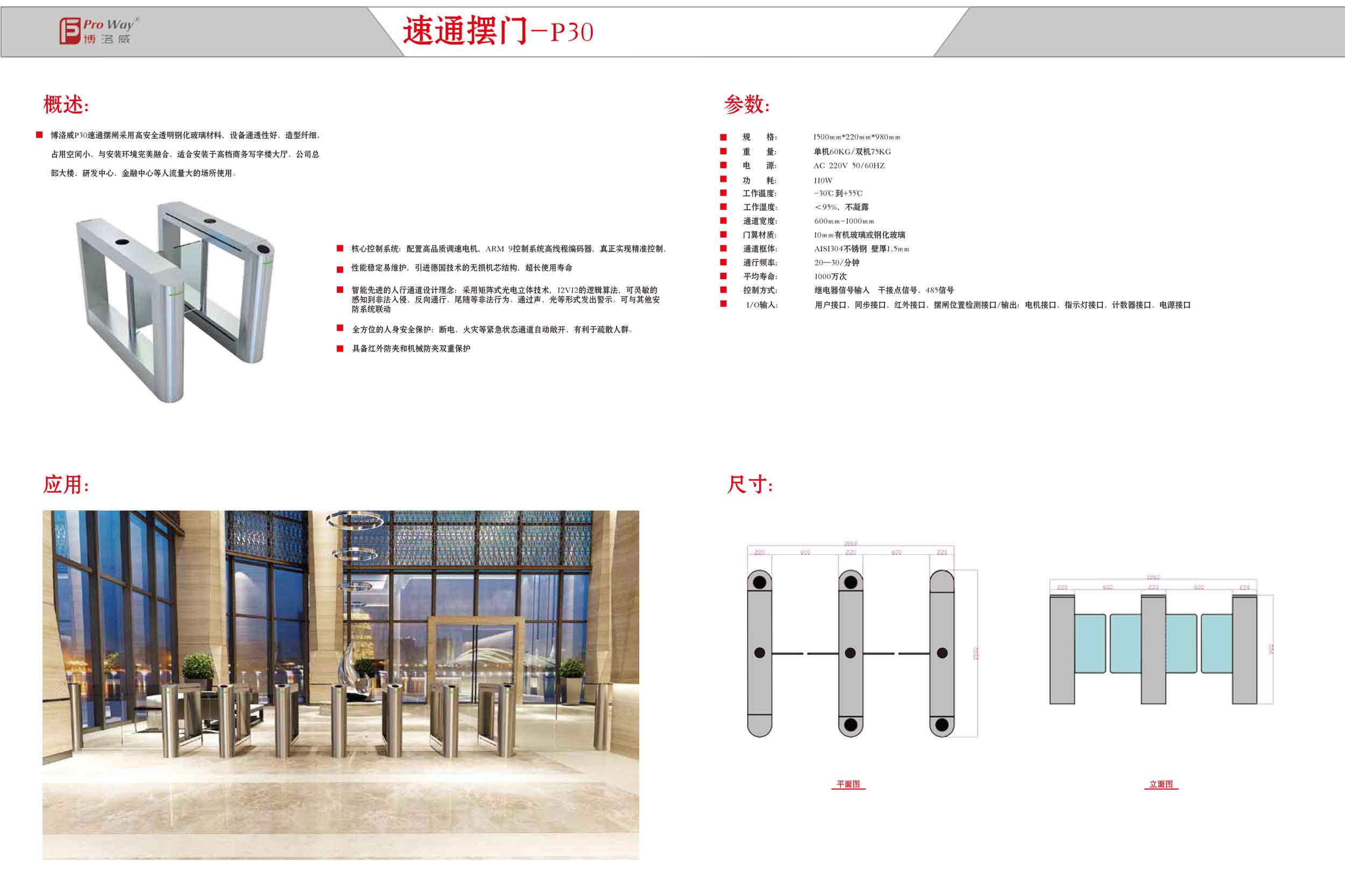擺閘-P30速通擺閘 適用范圍:ProWay博洛威 P30型號(hào)速通擺閘適用于人行通道管理,如企業(yè)、工業(yè)園、娛樂(lè)場(chǎng)所、景區(qū)、寫(xiě)字樓等場(chǎng)合。P30速通擺閘在常規(guī)通道內(nèi)均能正常使用。