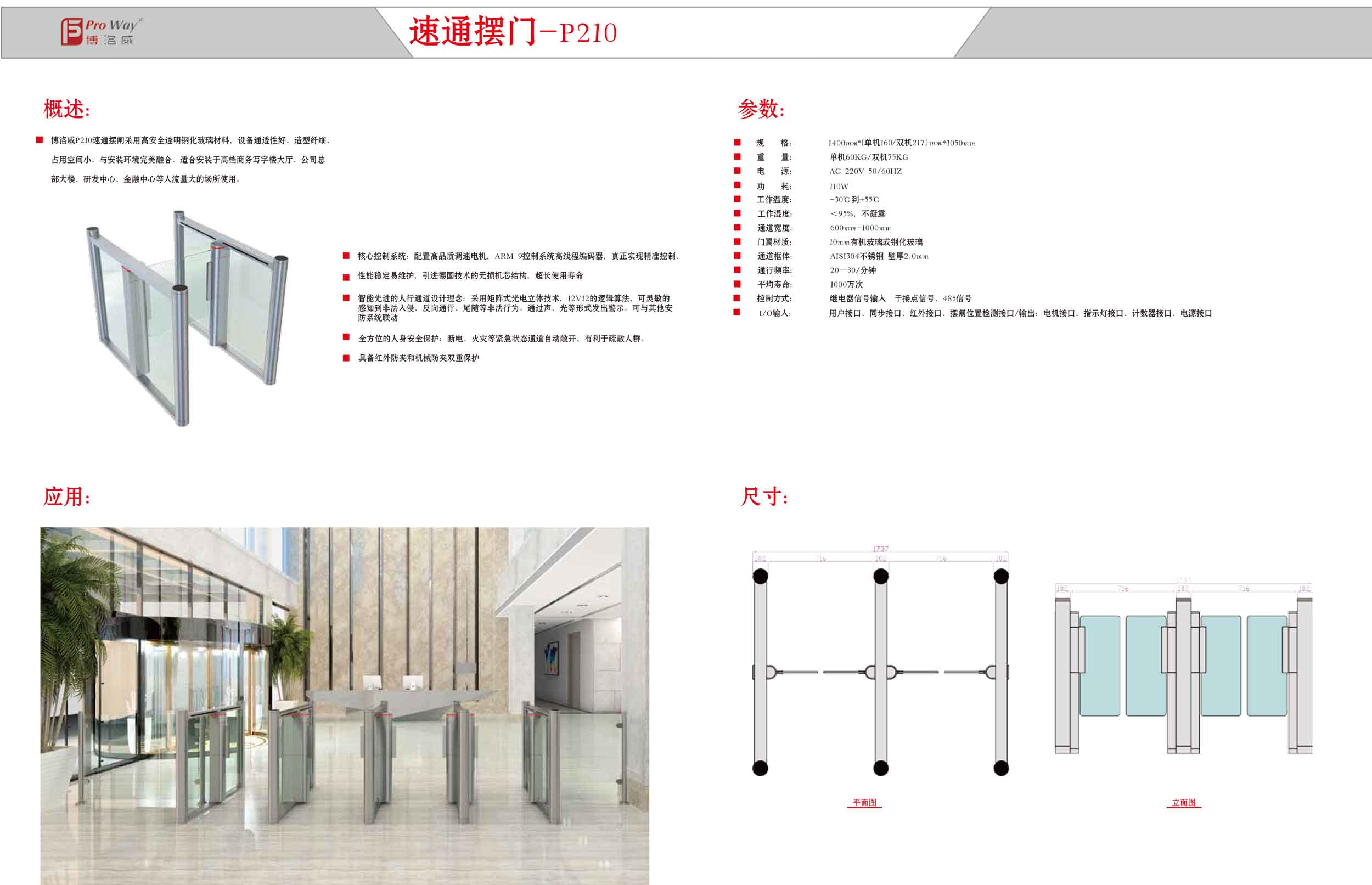 擺閘-P210速通擺閘采用高安全透明鋼化玻璃材料、設(shè)備通透性好、造型纖細(xì),占用空間小,與安裝環(huán)境完美融合,適合安裝于高檔商務(wù)寫字樓大廳、公司總部大樓、研發(fā)中心、金融中心等人流量打的場(chǎng)所使用。