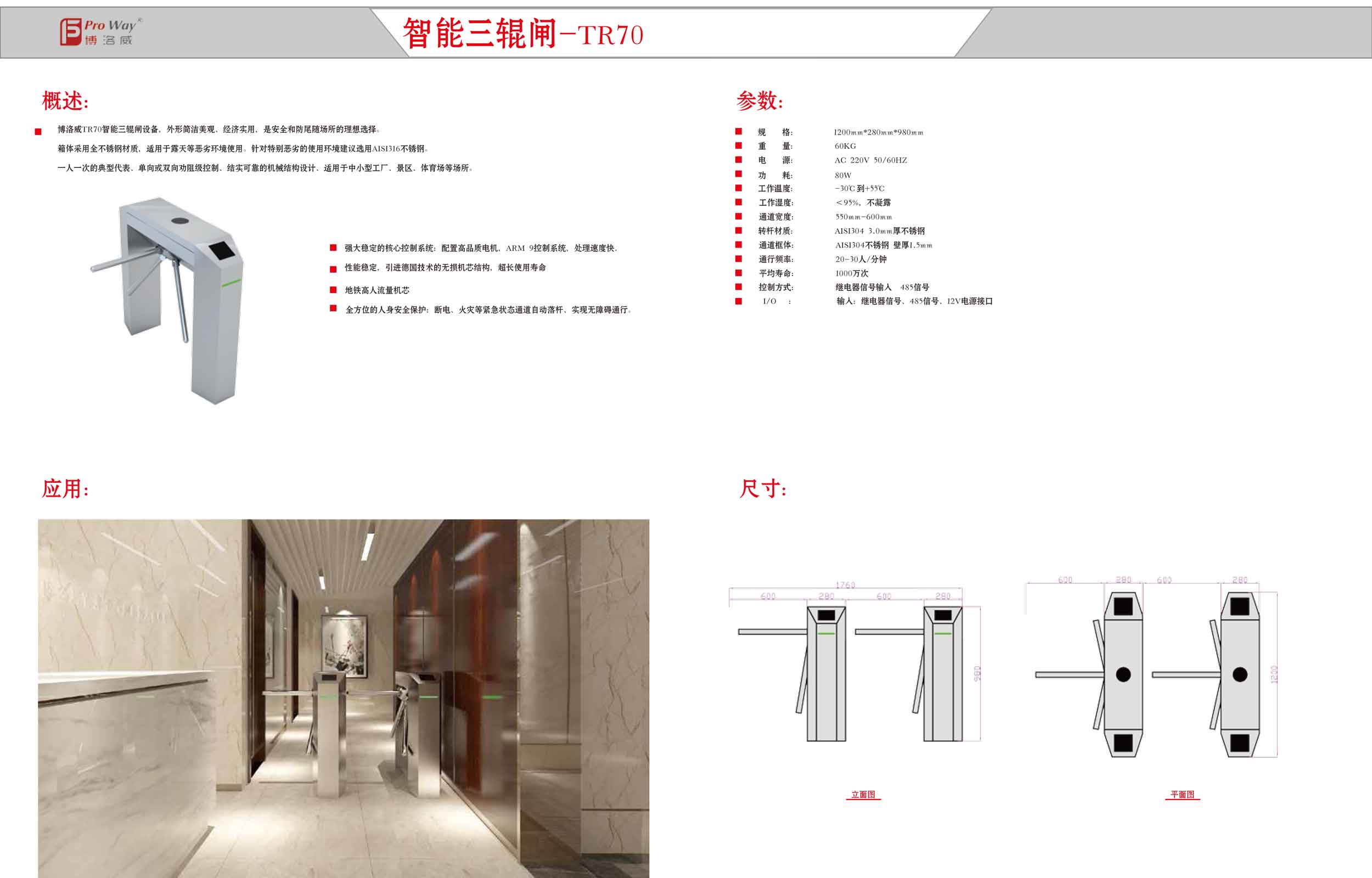 三輥閘-TR70三輥閘 適用范圍:ProWay博洛威 TR70型號(hào)三輥閘適用于人行通道管理,如企業(yè)、工業(yè)園、娛樂場(chǎng)所、景區(qū)等場(chǎng)合。TR70三輥閘在常規(guī)通道內(nèi)均能正常使用。